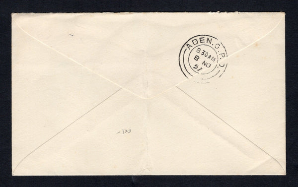 Cover franked with 1953 10c orange and 15c blue green QE2 issue (SG 50 & 52) tied by fine strike of KAMARAN cds dated 6 NOV 1957. Addressed to UK with ADEN G.P.O. transit cds on reverse.
