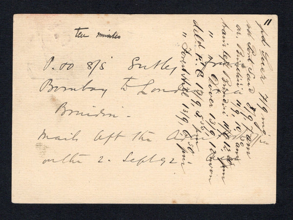 1a on ½a blue QV Indian Postal Stationery card (H&G 9) used with fine ADEN squared circle cds dated SEP 2 1892. Addressed to UK.