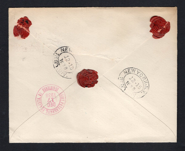Registered cover franked with 1937 2½a light blue and 3½a grey blue GVI 'Coronation' issue (SG 14/15) tied by ADEN cds's dated 30 NOV 1938 with printed blue on white 'ADEN' registration label alongside. Addressed to USA with transit & arrival marks on reverse. A nice commercial omnibus issue usage.