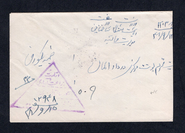 Cover franked on reverse with single 1965 50p rose red 'Official' issue (SG O287) tied by KABOUL cds dated 7.12.1969 with triangular 'Official' cachet in violet on front. Addressed locally. Uncommon issue on cover.