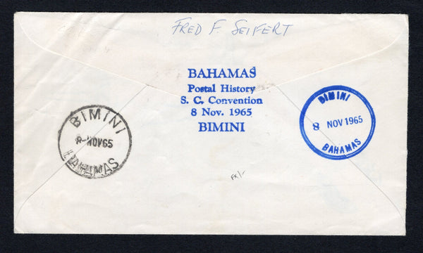 Cover franked with 1965 6d dull green, light blue & rose QE2 issue (SG 253) tied by superb strike of large BIMINI BAHAMAS 'Swordfish' cancel in blue with three line 'BIMINI 8 NOV 1965 BAHAMAS' cancel and BIMINI 'Negative Seal' cds alongside all in blue. Addressed to CANADA with two additional different BIMINI cds's on reverse. Very attractive.