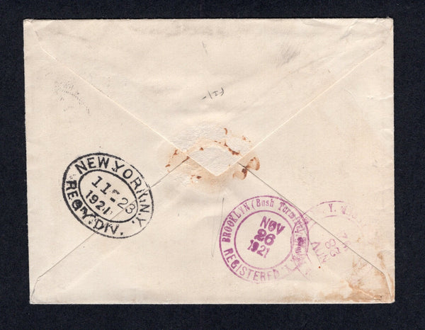 Registered cover with manuscript 'O.H.M.S.' at top franked with 1921 3d purple on pale yellow (SG 213) tied by BARBADOS R.L.O. cds dated 15 NOV 1921 with printed blue on white 'BARBADOS' registration label alongside. Addressed to USA with transit & arrival marks on reverse. A fine cover showing a second day of issue use of the 3d.