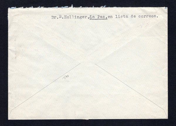 Circa 1937 undated cover with manuscript 'Par Avion' at top franked with pair 1935 1½ Bs. orange yellow 'Map' issue, 1937 12 Bs. On 10c 10c black & orange red AIRMAIL issue with 'Correo Aereo D.S.' surcharge and 1938 60c deep blue (SG 304, 326 & 341) all tied by undated LA PAZ SERVICIO AEREO POSTAL cancels in purple. Addressed to SWITZERLAND. The airmail surcharges are uncommon used on cover.