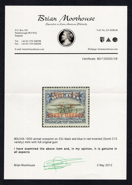 25c black & blue 'Establishment of National Aviation School' AIRMAIL issue with overprint in normal red ink showing variety OVERPRINT INVERTED. A fine mint copy. Rare, only 100 were issued. 2012 B. Moorhouse certificate accompanies. (SG 232 variety, Sanabria #25a)