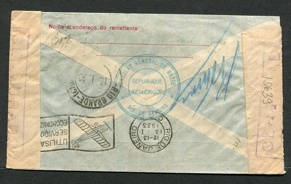 Airmail cover franked with 1920 200rs rose 'Industry' issue and 1929 500rs purple AIR issue (SG 313 & 472) tied by CORREIO AEREO RIO DE JANEIRO cds's with blue CONSULAT GENERAL DE GRECE cachet on front & reverse. Addressed internally to RIO GRANDE with plain white censor strips with large 'CENSURADA' handstamps in purple at both ends of the cover.