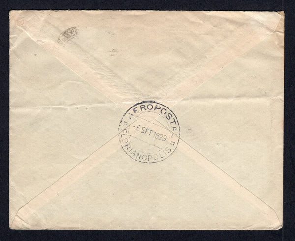 Cover franked with 1920 500rs red brown 'Industry' issue and 1929 500rs on 50rs black & slate, 2000rs on 20,000rs black and 5000rs on 20,000rs black & blue 'SERVICIO AEREO' overprint issue (SG 360, 447, 451 & 452) tied by FLORIANOPOLIS cds's dated 6. IX. 1929 with boxed 'CORREIO AEREO LINHAS C.G.A.' marking in black alongside and AEROPOSTAL FLORIANOPOLIS cds in black on reverse. Addressed to SWITZERLAND.