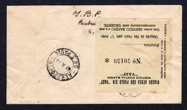 Cover franked with 1939 400rs bright ultramarine and 800rs bluish green (SG 619 & 621) tied by circular CORREIOS E TELEGRAFOS S. PAULO FEIRA NAC. DE INDUSTRIAS 22 DEZ 1940 cancels in green with "VASP" 23 DEZ 1940 MANHA S.PAULO marking plus 'Servicio Postal Rapido VASP Feira Nacional de Industrias de Sao Paulo Setembro 1940' airplane cachet and VASP airmail label all on front. Addressed to RIO DE JANEIRO with large printed pale yellow 'Servicio Postal Rapido VASP' label on reverse with transit & arrival marks.