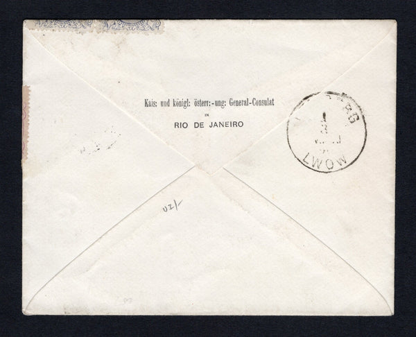 Cover with printed 'Kais: und Konigl: oster:-ung: General-Consulat in RIO DE JANEIRO' on reverse franked with 1884 50c blue 'Numeral' issue and 1890 100rs mauve 'Southern Cross' issue (SG 80 & 90a, stamps folded over edge of envelope) tied by RIO DE JANEIRO cds's dated 5 FEV 1890. Addressed to AUSTRIA with arrival cds on reverse. A scarce combination of issues and very early use of the Souther Cross issue just 15 days after the date of issue.
