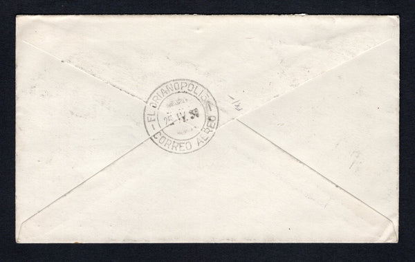 Cover with manuscript 'Via Nyrba' in red at top franked with 1920 10rs purple, pair 20rs olive grey, 50rs claret and 2 x 100rs turquoise green 'Industry' issue and 1927 1000rs on 20rs black & olive and 2000rs on 200rs black & blue 'SERVICIO AEREO' overprint issue (SG 302/303, 381/382, 448 & 450) all tied by ITAJAHY S. CATHARINA cds's dated 25 ABR 1930. Addressed to USA with FLORIANOPOLIS CORREO AEREO transit cds on reverse. Nice commercial use of the Nyrba service.