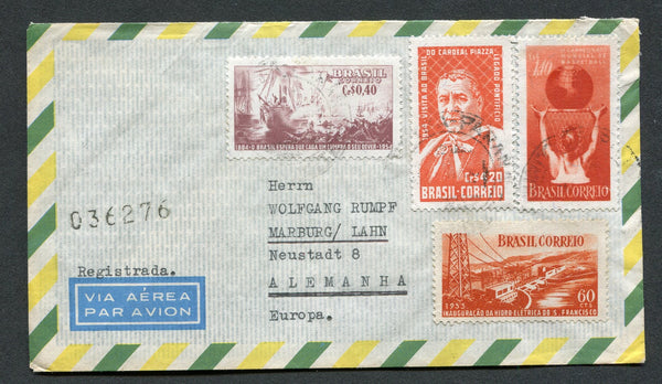 Registered airmail cover franked with 1954 4cr 20c orange red, 40c purple brown & 1cr 40c deep orange red and 1955 60c deep brown orange (SG 907, 911, 916 & 920) tied by light CURITYBA cds's. Addressed to GERMANY with lovely large black & green 'Visite o Parana 1st Centenario Emancipacao Politica 19 XII 1953 1st Exposicao Internacional do CAFE' CINDERELLA label with view of 'Clube Curitibano' on reverse. Very attractive.