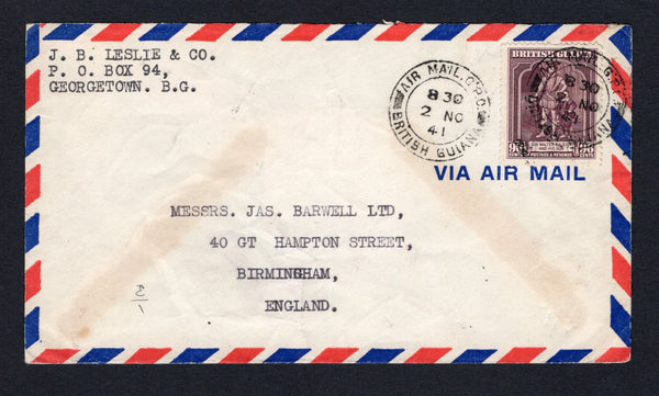 Airmail cover franked with single 1938 96c purple GVI issue (SG 316) tied by AIRMAIL G.P.O. cds dated 2 NO 1941 with fine second strike alongside. Addressed to UK with fine blue & red illustrated Red Cross CINDERELLA label inscribed 'British Guiana' depicting a bombed street scene and Nurses head on reverse.