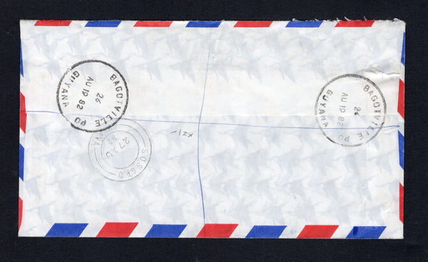 Registered airmail cover franked with 1982 110c on 3c black & venetian red 'Revenue' issue with 'ESSEQUIBO IS OURS' overprint and 15c on 2c 'Flower' issue with 'Scout Movement 1907-1982' overprint (SG 952 & 896) tied by BAGOTVILLE skeleton cds dated AU 19 1982. Addressed to GEORGETOWN with arrival cds on reverse. The 'Essequibo is Ours' overprints were produced in 1982 due to renewed military interest the region from Venezuela and are uncommon used on cover.