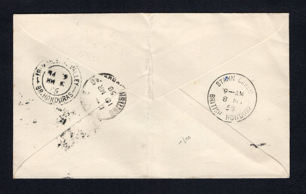 Cover franked with 1953 1c green & black & 5c deep olive green & scarlet QE2 issue (SG 179 & 183) tied by good strike of 18¼ MLS. S/C. VALLEY cds dated MR 5 1958. Addressed to UK with STANN CREEK and BELIZE transit cds's on reverse. A scarce origination.