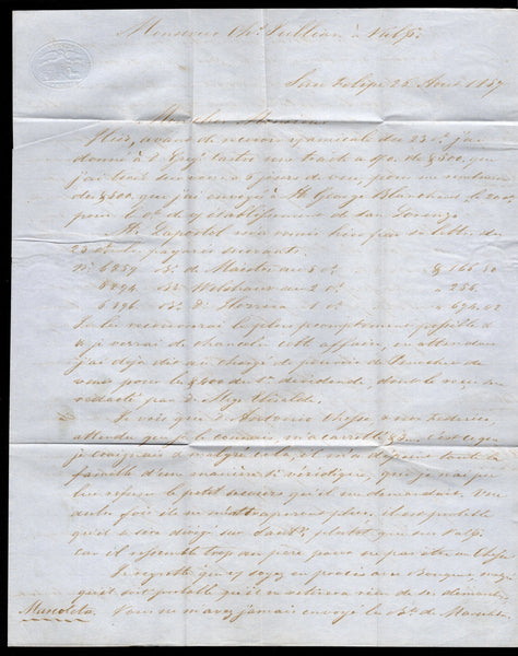 Cover datelined 'Sn Felipe 25 Aout 1857' inside franked with diagonally BISECTED 1856 10c deep blue 'Estancos' printing, worn impression (SG 28b) tied by 'Target' cancel in black with fine SAN FELIPE cds in red alongside dated 24 AGTO 1857. Addressed to VALPARAISO. Fine & scarce.