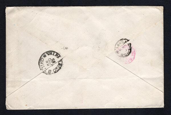 Cover with manuscript 'Via Magallanes' at top franked with single 1878 20c slate grey 'Roulette' issue (SG 62) tied by SANTIAGO cds dated 25 X. 1893. Addressed to ARGENTINA with VAPARAISO transit cds and Argentinian arrival cds's on reverse.