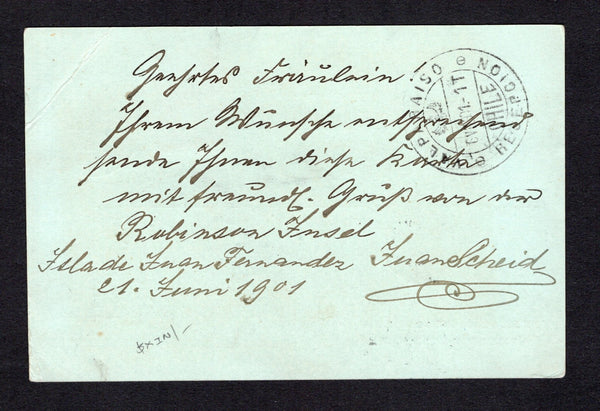 2c ultramarine on light blue postal stationery card (H&G 16) datelined 'Robinson Insel, Isla Juan Fernandez, 21 Juni 1901' on reverse used with added 1900 2c lake 'Cabezone' issue (SG 83) tied by two strikes of ISLAS DE JUAN FERNANDEZ cds dated 21 JUN 1901. Addressed to SWITZERLAND with VALPARAISO transit cds on reverse and Swiss arrival cds on front. A rare early card from Juan Fernandez.