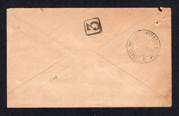 Cover franked with single 1878 5c bright ultramarine 'Roulette' issue (SG 59) tied by RANCAGUA cds. Addressed to SANTIAGO with arrival cds and boxed '3' postman's numeral on reverse.