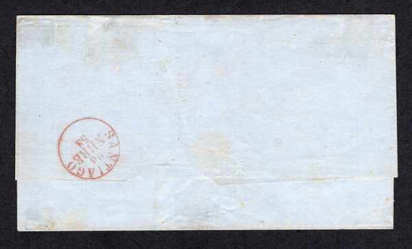 Cover franked with diagonally BISECTED 1856 10c grey blue 'Estancos' printing, poor impression (SG 27) tied by 'Target' cancel in black with CONCEPCION cds in blue alongside dated 22 NOV 1858. Addressed to SANTIAGO with arrival cds on reverse then readdressed to VALPARAISO. Fine & scarce.