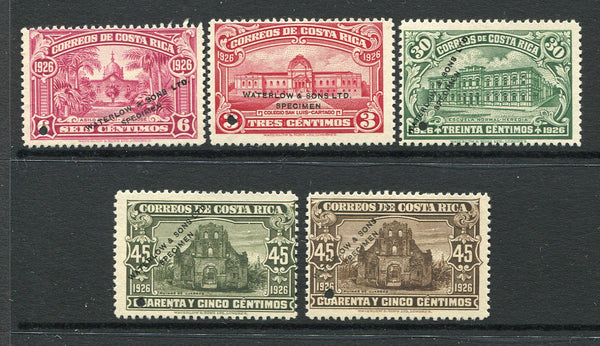 'Buildings' issue WATERLOW COLOUR TRIAL set of five, perforated comprising the 3c in carmine, 6c in lake, 30c in green and 45c two different examples in sepia and olive green all with 'Waterlow & Sons Ltd Specimen' overprint in black & small hole punch. (SG 165/168, Mena #S143/S146b)