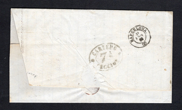 Complete folded letter franked with 1866 pair 10c blue and 20c green 'Isabella' NEW CURRENCY issue, all four margin copies (SG 20/21) tied by oval 'Lines' cancels with unclear HABANA cds alongside. Addressed to BARCELONA, SPAIN with arrival cds and oval CARTERO 7A SECCION marking on reverse. An attractive franking.