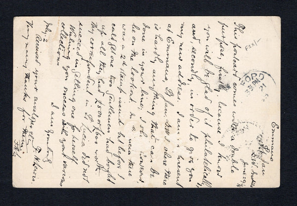 2c light blue postal stationery card (H&G 12) datelined 'Emmaus, St. Jan, D.W. Indies, June 29 '98' on reverse used with added 1873 1c brown lake & yellowish green (SG 11, with frame inverted) tied by superb strike of ST. JAN cds dated 5 / 7 1898. Addressed to UK with ST. THOMAS transit cds on front and OXFORD arrival cds on reverse. A superb and attractive item from the rarest village post office of the Danish West Indies.