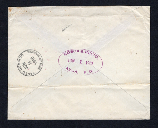 Printed 'Noboa & Recio, Azua, Rep. Dominicana.' cover with oval 'NOBOA & RECIO AZUA, R.D.' cachet on reverse dated JUN 1 1910 franked with 1906 5c black & blue 'Arms' issue (SG 163) tied by 'Lines' cancel with fine strike of 'S.S. "CHEROKEE"' ship marking in blue on front. Addressed to USA with SANTO DOMINGO transit cds on reverse.