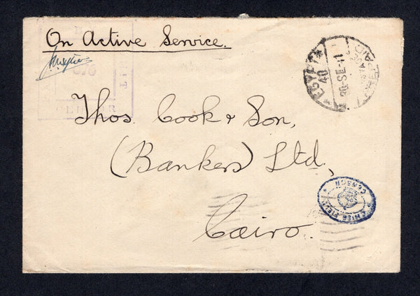 Stampless 'On Active Service' cover with EGYPT POSTAGE PREPAID '40' cds of A.P.O. S.240 with square PASSED BY UNIT CENSOR 676 cachet in purple and small oval CHIEF FIELD CENSOR mark in blue, both on front. Addressed to THOMAS COOK with COOK (CAIRO) arrival cds on reverse.