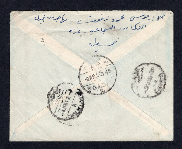 Cover franked with 1948 13m carmine and 22m deep blue 'PALESTINE' overprint issue (SG 8 & 12) tied by GAZA cds with boxed 'GAZA' registration marking in black and small circular censor mark in purple alongside. Addressed to CAIRO with arrival cds's on reverse.