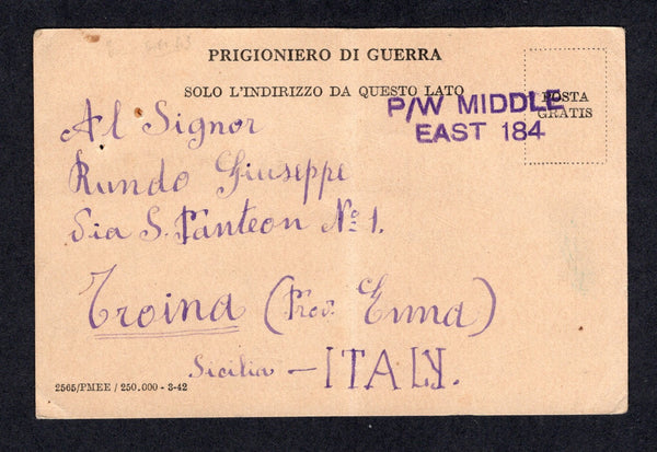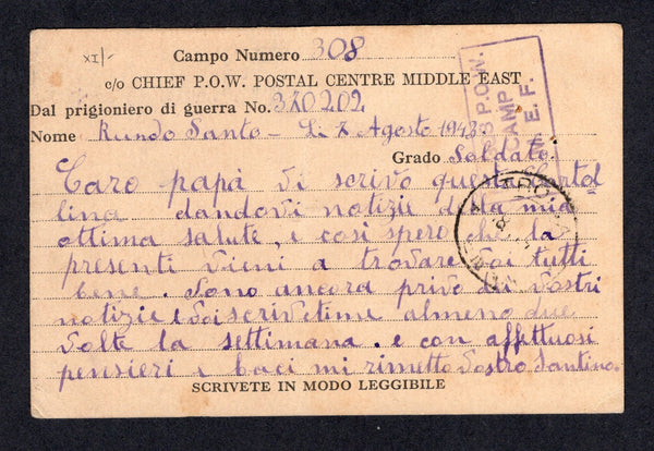 Printed 'Prigioniero de Guerra' POW card an Italian POW with 'Campo Numero 308' on reverse with 'P/W MIDDLE EAST 184' handstamp in purple on front and boxed 'No. 308 P.O.W. CAMP M.E.F.' cachet on reverse (Located at Helouan, Egypt). Addressed to ITALY with arrival cds on reverse.