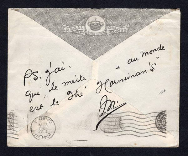 Cover franked with 1937 2m vermilion and 15m brown purple 'King Farouk' issue (SG 249 & 256) tied by ALEXANDRIA cds dated 5 SE 1941 with fine red, blue & orange BRITISH COMMUNITY WAR FUND 'Lion' CINDERELLA label on front. Addressed to UK with censor marks on front & reverse. Backflap missing.