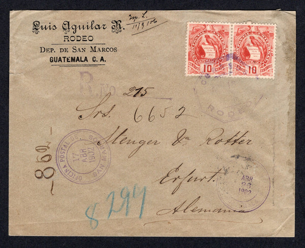 Cover franked with pair 1866 10c scarlet vermilion 'Quetzal' issue on front tied by fine octagonal RODEO cds dated ABR 16 1902 and 1900 1c deep green and pair 2c rose carmine on reverse tied by partial strikes of the same cds (SG 48, 101 & 102). Sent registered with unframed 'R. No. 215' marking of RODEO and re-registered in transit with fine strike of OFICINA POSTAL DE SAN MARCOS cds dated 17 ABR 1902 with manuscript '852' registration number alongside all on front. Addressed to GERMANY with transit and arrival marks on front & reverse. A scarce origination for registered mail.