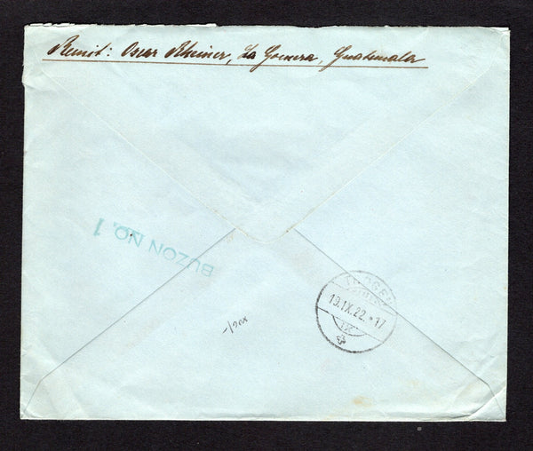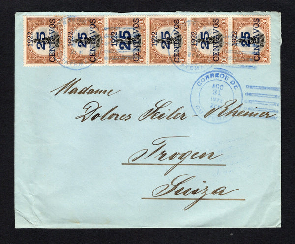 Commercial cover franked with 1922 25c on 1p black & brown, a fine vertical strip of six showing overprint types A, B & C (SG 189A/189C) tied by GUATEMALA CITY cds's dated AGO 31 1922. Addressed to SWITZERLAND with straight line 'BUZON NO.1' marking in blue on reverse with Swiss arrival cds alongside. A fine & rare franking.