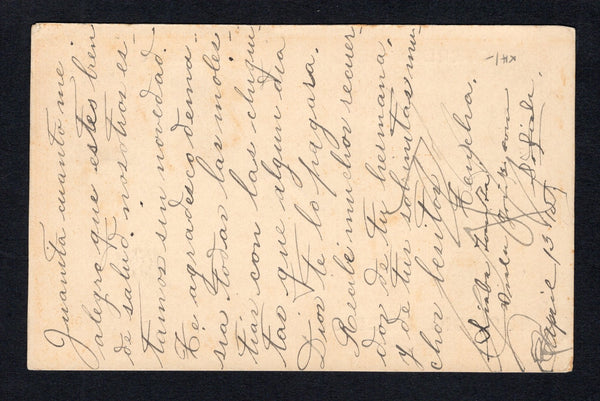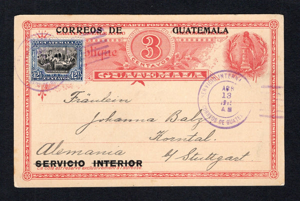 3c carmine postal stationery replycard with 'CORREOS DE GUATEMALA SERVICIO INTERIOR' overprint in black with 'SERVICIO INTERIOR crossed out (H&G 12a, the reply half) used with added 1902 12½c black & blue (SG 121) tied by GUATEMALA CITY cds dated APR 13 1915. Addressed to GERMANY.