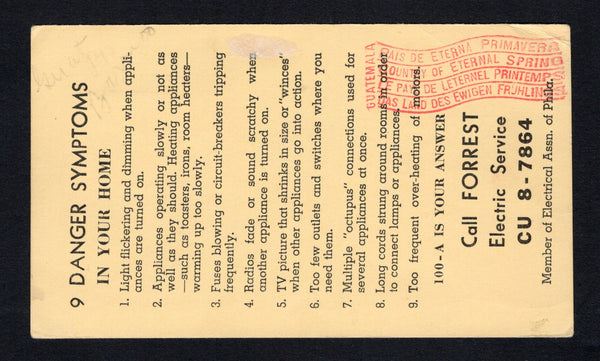Electrician's commercial postcard franked with 1953 2c deep olive green & chestnut and 1949 1c blue TAX issue (SG 536 & 479) tied by two fine strikes of CORREOS DE GUATEMALA AMBULANTE POSTAL No. TRES LINEA GUATEMALA PTO BARRIOS cds in blue dated 15 OCT 1957. Addressed to USA.