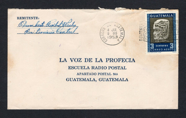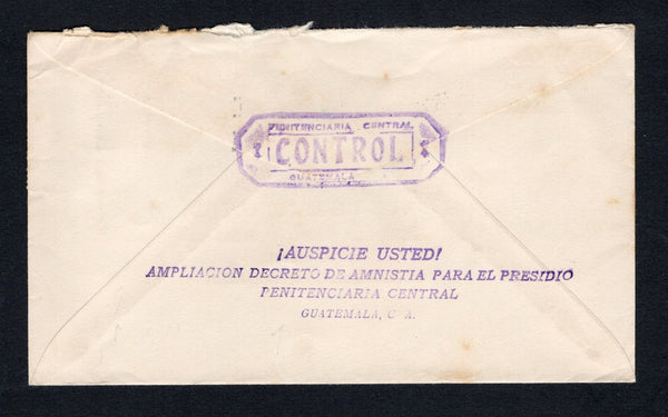 Cover with manuscript 'Penitenciaria Central' return address at top franked with single 1953 3c drab & deep blue (SG 528) tied by GUATEMALA CITY machine cancel dated 4 JUL 1953. Addressed locally within GUATEMALA CITY with boxed 'PENITENCIARIA CENTRAL CONTROL GUATEMALA' censor marking in purple and '!Auspicie Usted! Ampliacion decreto de amnistia para el presidio penitenciaria central Guatemala C.A.' cachet on reverse asking for support for the prison amnesty.