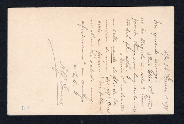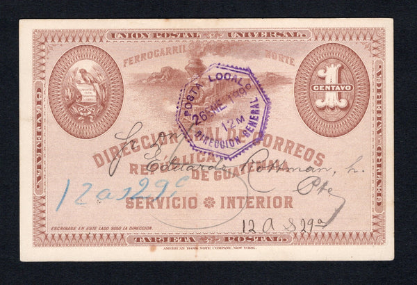 1c brown on white 'Train' postal stationery card (H&G 6) used with POSTA LOCAL DIRECCION GENERAL octagonal cancel in purple dated 26 JAN 1898. Addressed locally with commercial message on reverse showing the correct local usage.