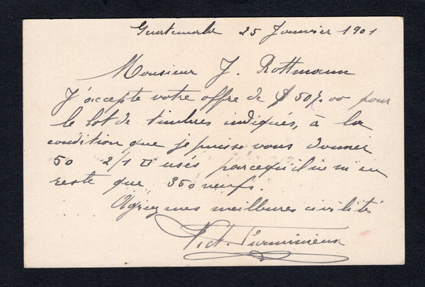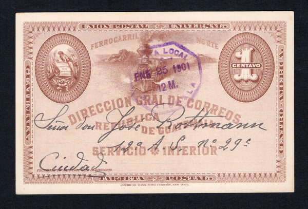 1c brown on white 'Train' postal stationery card (H&G 6) used with POSTA LOCAL GUATEMALA octagonal cancel in purple dated JAN 25 1901. Addressed locally with commercial message on reverse showing the correct local usage.