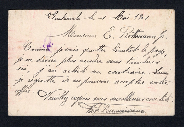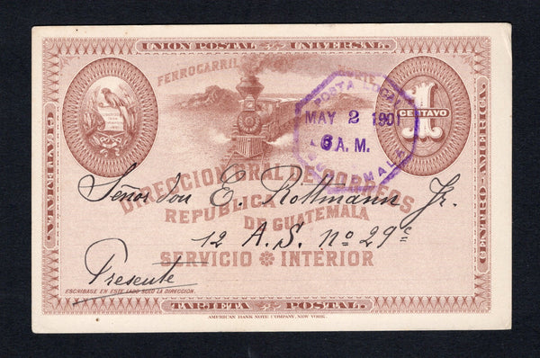 1c brown on white 'Train' postal stationery card (H&G 6) used with POSTA LOCAL GUATEMALA octagonal cancel in purple dated MAY 2 1901. Addressed locally with commercial message on reverse showing the correct local usage.