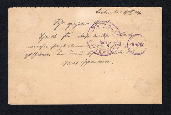 3c + 3c black & pink postal stationery reply card (H&G 10a) the reply half only correctly used back from Germany datelined 'Berlin, 6. II. 04' on reverse with added Germany 1902 10pf carmine (SG 70) tied by BERLIN S.W. cds dated 1. 3. 04. Addressed to SAN JOSE DE GUATEMALA with RECIBIDA EN GUATEMALA 10 A.M. arrival cds dated APR 1 1904 on reverse. Card has a couple of small scuffs but otherwise a very rare correct use of the reply card.