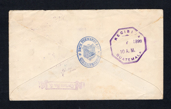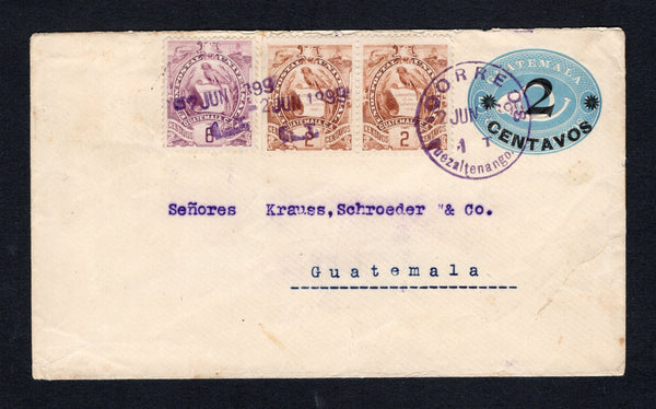 2c on 5c blue postal stationery envelope (H&G B13) used with added 1886 pair 2c yellow brown and 6c mauve 'Quetzal' issue (SG 44 & 47) tied by QUEZALTENANGO cds dated 2 JUN 1899 plus two further strikes of the '2 JUN 1899' datestamp. Addressed to GUATEMALA CITY with small 'Cartero No. 5' SCROLL marking and arrival cds on reverse. Very fine.