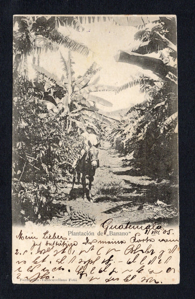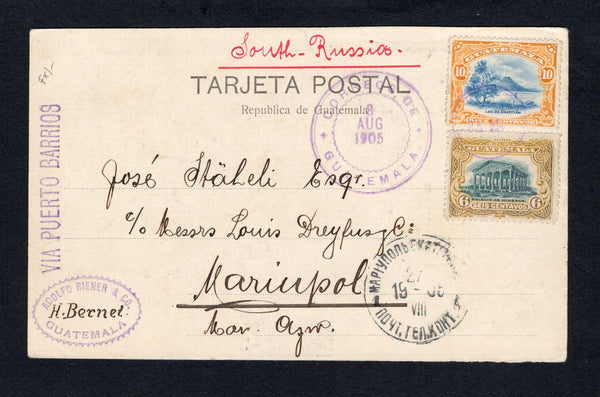 Black & white PPC 'Plantacion de Banano' franked on message side with 1902 6c blue green & bistre and 10c blue & orange (SG 119/120) tied by GUATEMALA CITY duplex cds dated 8 AUG 1905. Addressed to MARIUPOL, SOUTH RUSSIA with arrival cds on front.