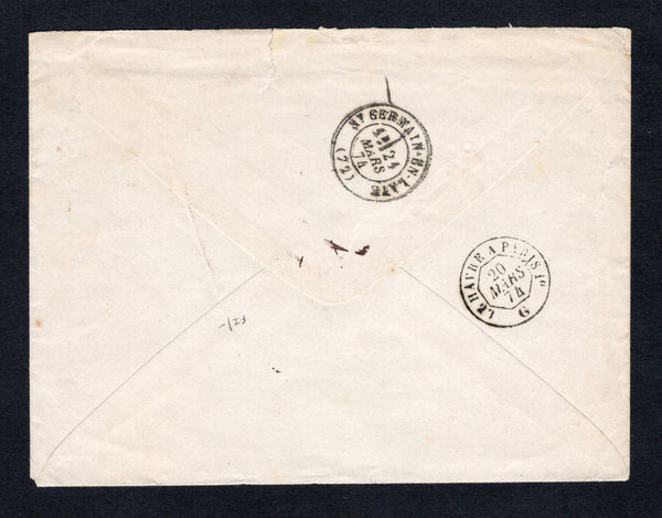 Cover with manuscript 'Par Vapeur 'Lafontaine' du Havre' at top and oval 'L.AUGUSTE & CIE CAP-HAITIEN' company handstamp in blue below rated '8' decimes In manuscript with OUTRE-MER LE HAVRE cds in red dated 20 MARS 1875. Addressed to FRANCE with transit & arrival cds's on reverse. Couple of small edge tears.