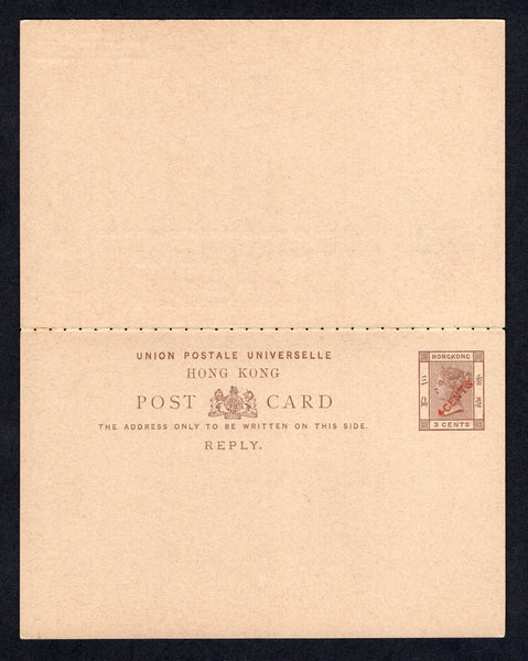 '4 CENTS' + '4 CENTS' on 3c + 3c brown QV postal stationery reply card (H&G 13), a fine unused example.