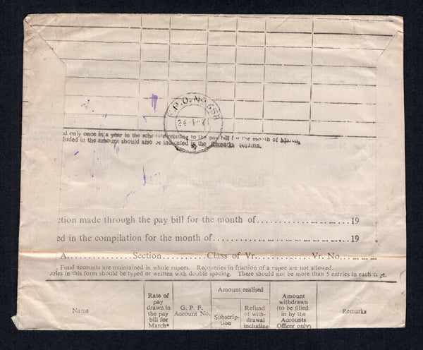 Stampless 'FREE ON ACTIVE SERVICE' cover with circular 'ICS CONSTRUCTION COMPANY GREF' cachet in violet with F.P.O. No. 658 cds on reverse dated 24.1.1971. Addressed to 'HQ DGBR Kashmir House DHQ, P.O. New Delhi 11'. The GREF was heavily involved in protecting India's borders during the 1971 India-Pakistan War.