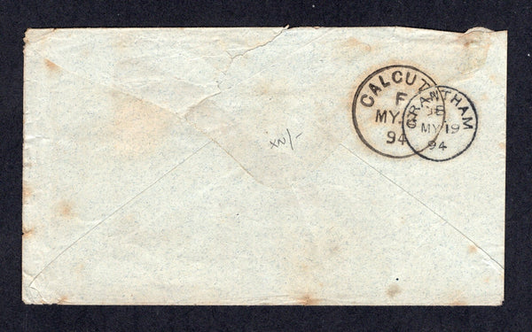 Cover franked with 1882 ½a blue green and pair 1a plum QV issue (SG 85 & 89) tied by three strikes of TINSUKIA squared circle cds. Addressed to UK with CALCUTTA transit and UK arrival cds's on reverse.