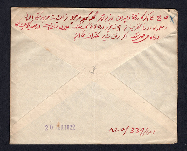 Cover franked with India 1911 1a rose carmine and 2a purple GV issue (SG 159 & 166) tied by large BUSHIRE squared circle cds. Addressed to UK.