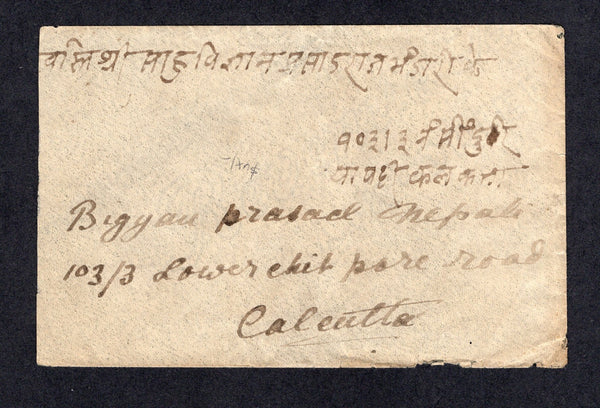 Cover franked on reverse with INDIA 1911 ½a light green 'GV issue' (SG 155) tied by good NEPAL cds. Addressed to CALCUTTA, INDIA with arrival cds also on reverse.
