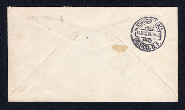 Cover franked with single 1929 9d maroon GV issue (SG 110) tied by KINGSTON cds dated DEC 10 1930. Flown on the Kingston - Mexico City first flight with large circular first flight cachet on front and MEXICO CITY arrival cds on reverse. A rare flight unlisted by Muller. (Muller #Unlisted)