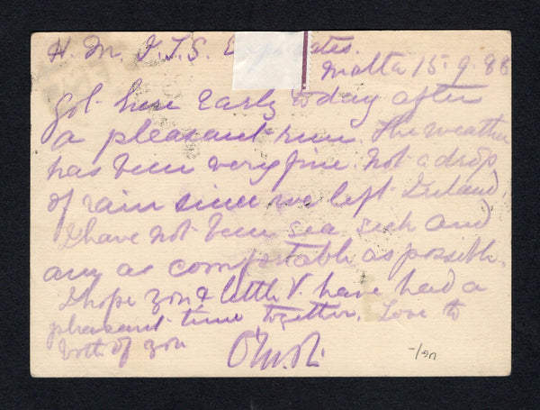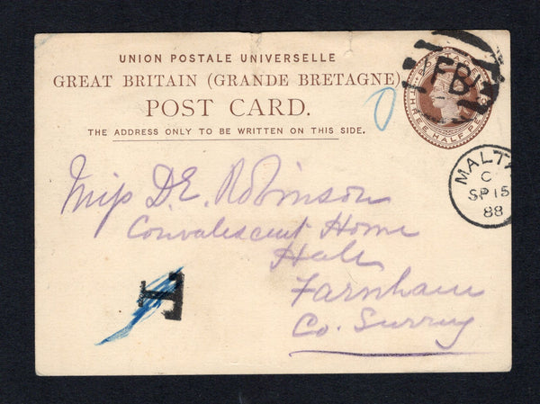 1½d brown on buff QV postal stationery card of Great Britain (H&G 8) datelined 'H. M. I. T. S. Euphrates, Malta 15.9.88' (Her Majesty's Indian Troop Ship Euphrates) on reverse initially treated as inadmissible due to being sent from Malta with 'O' in blue crayon alongside stamp imprint and MALTA cds dated SP 15 88 struck away from the stamp imprint and small unframed 'T' tax marking alongside. Addressed to UK with stamp cancelled by barred 'FB' (Foreign Branch) marking in black with the tax mark crossed out in blue manuscript. Small repaired tear at top but otherwise a very scarce item.