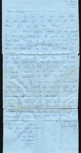 50c blue QE2 'Seashell' postal stationery airletter (H&G Unlisted) datelined 'M. Josee Rousseby, St. Louis College, Port Mathurin, Rodiguez' inside used with RODRIGUEZ cds dated 26 OC 1972. Addressed to FRANCE. Full commercial message inside.